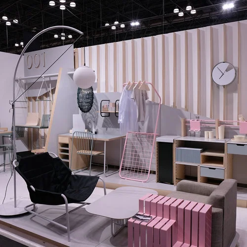 As any group of young people are wont to do, Section 001 stayed on trend with, well, the trends. Muted greens and millennial pinks covered multipurpose wire frames, minimal seating, and extremely functional (and pretty) shelving units.