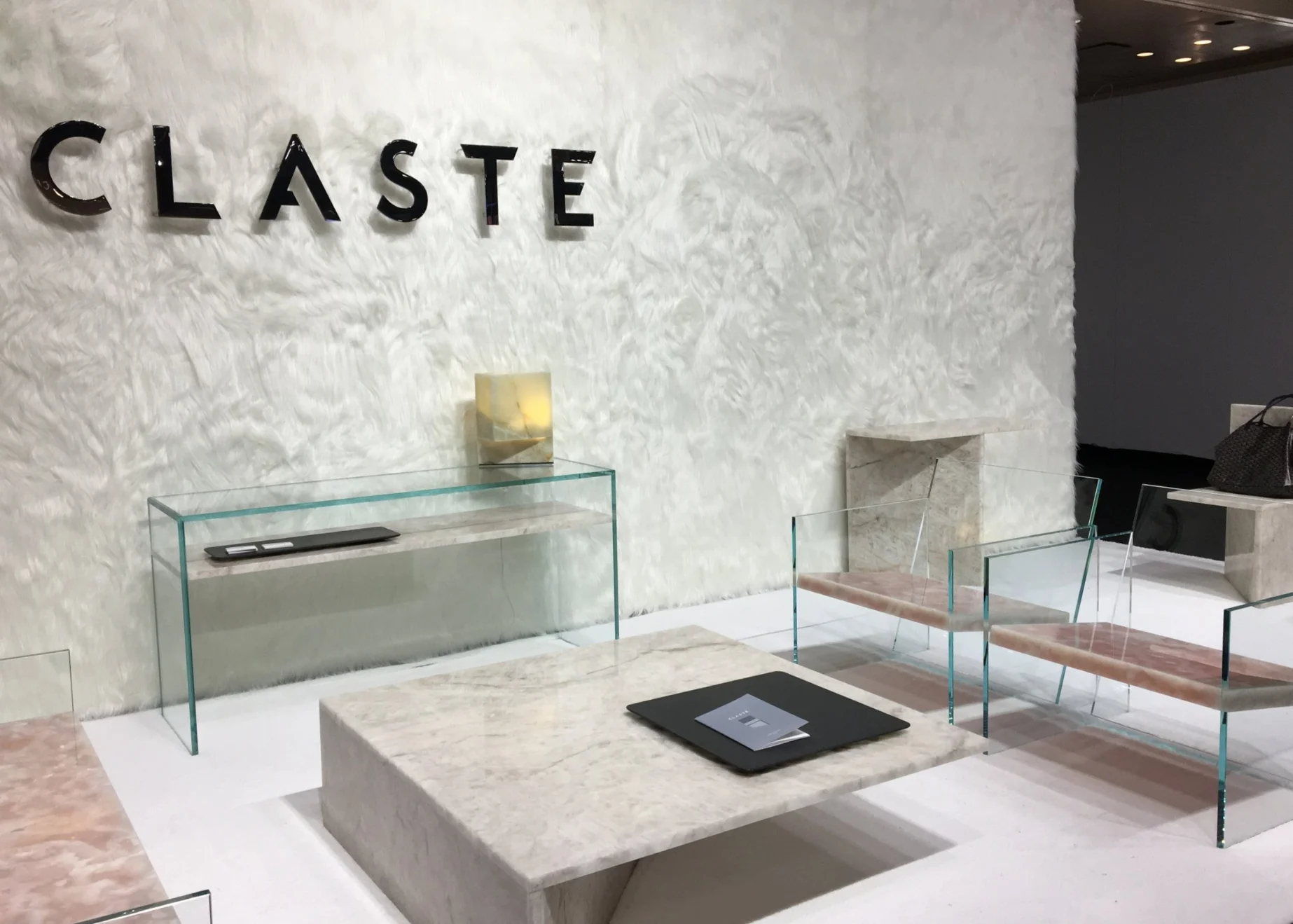 Claste is a Montreal-based design studio that specializes in "collectible design and contemporary furnishings for residential and commercial markets.” Founded by Philip Hazan, Quinlan Osborne, and Martin Poitras, the studio presented a beautiful collection of glass, pink onyx, and bianco quartzite. The thick slabs of stone were visually lightened in soft colors of cotton candy pink and rainy day grey. The green-edge glass kept the furnitures from disappearing into the neutral background while simultaneously highlighting the "intemporality" of the studio's self-proclaimed religion. The set-up transcends time and space and each piece would be at home in a 1970's Floridian condo or a 2020 luxury hotel.