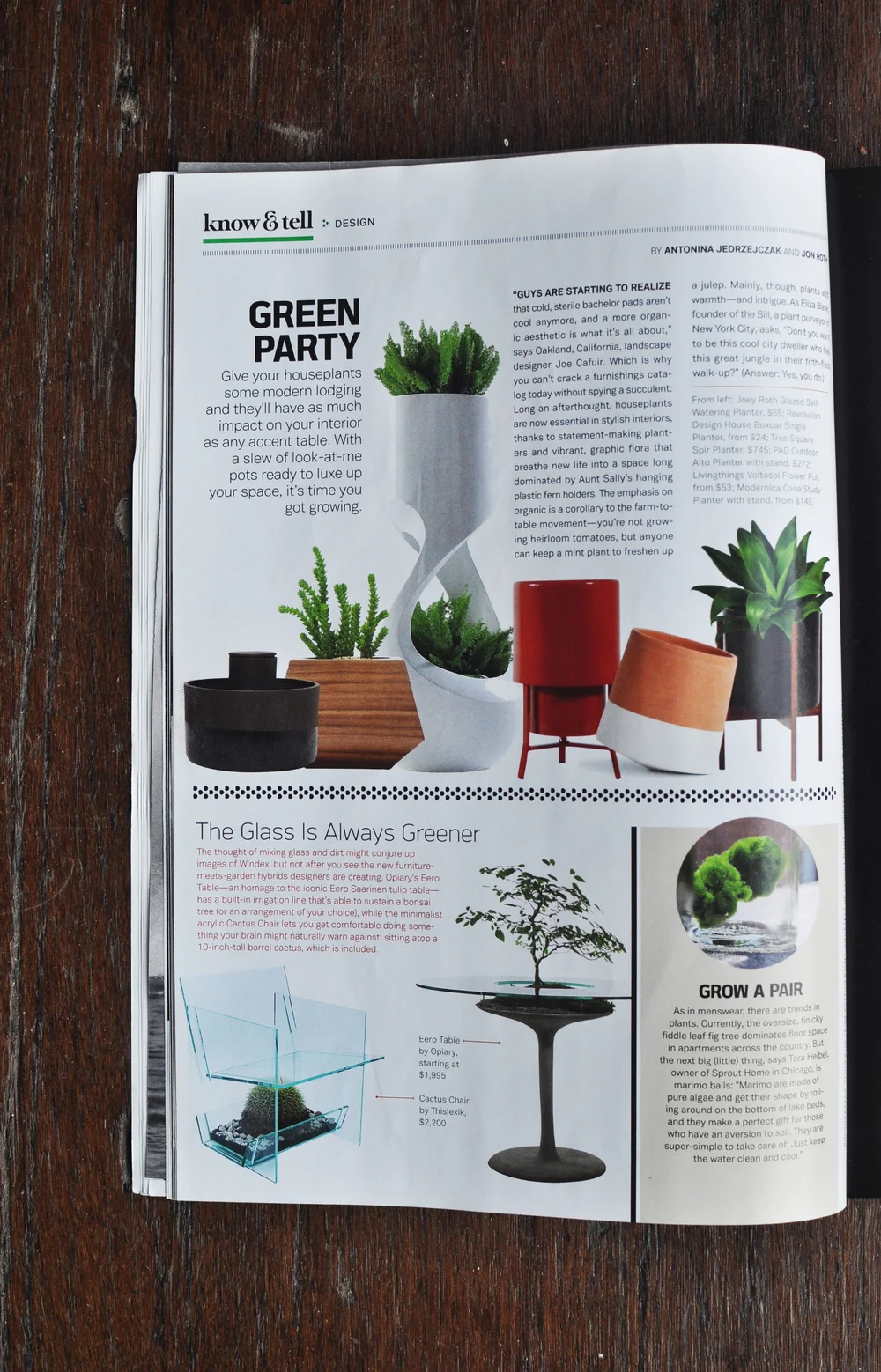 We are so pleased with Details Guide to House Plants featuring the Cactus Chair. We hope you can enjoy the comedic element of sitting atop a cactus in this humid summer heat! Surprisingly comfortable, surprisingly cool. Might we add that there is minimal maintenance required for this houseplant and with the barrel cactus being a part of the chair, you leave valuable floor space open for more succulents.